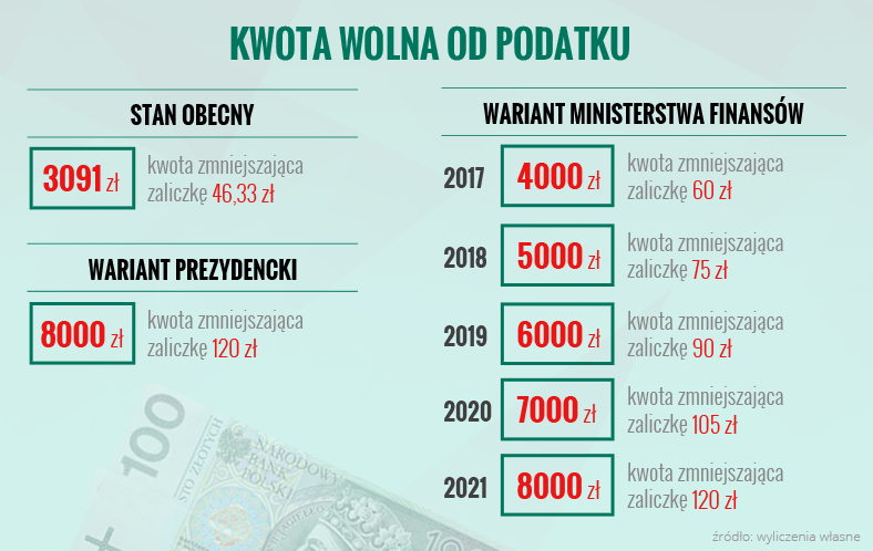 Kwota wolna od podatku w 2019 - SuperGrosz - Blog from supergrosz.pl Wszyscy oni po cichu liczą na informację o podniesieniu wspomnianej kwoty. Obecnie, w 2020 roku, kwota wolna od podatku obowiązuje dochody nie przekraczające kwoty 8 tysięcy złotych. Poniżej przedstawiamy ile wynosi kwota wolna od podatku 2020 i jak obliczyć kwotę zmniejszającą podatek. Sprawdź od jakiej kwoty nie musisz płacić podatku i jakie progi ją określają. Przed długi czas wynosiła 3091 zł, później w 2018 roku został podniesiona do 6600 zł, natomiast od minionego roku podatku nie trzeba odprowadzać nawet od 8000 zł. Kwota wolna od podatku to wysokość dochodu, od której nie trzeba odprowadzać podatku. Wysokość kwoty wolnej od podatku, co roku budzi ogromne zainteresowanie podatników. Kwota wolna od podatku to suma od której w rozliczeniu pit 2020/2021 nie musimy odprowadzać podatku.